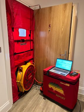 An air tightness test is usually carried out in the final phase of construction. It measures total air lost through leaks in the fabric of the building, which contributes to energy and heat loss. To carry out the test, one of our team fit a powerful fan into an exterior door frame and depressurises the interior space, as this makes it easier to identify leakage paths by drawing air into the building.